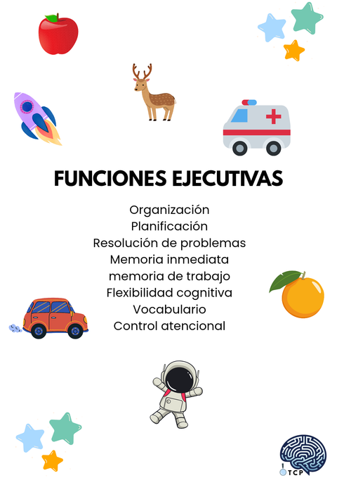 Las Funciones Cognitivas son: Lenguaje, Memoria, Atención y Funciones Ejecutivas ( lóbulo frontal). Las Funciones Ejecutivas coordinan las habilidades como organización, planificación, flexibilidad cognitiva, control inhibitorio, resolución de problemas, automonitoreo de la conducta y la emoción, juicio, toma de decisiones, memoria de trabajo (opera la información entre la memoria a corto plazo y la memoria a largo plazo).